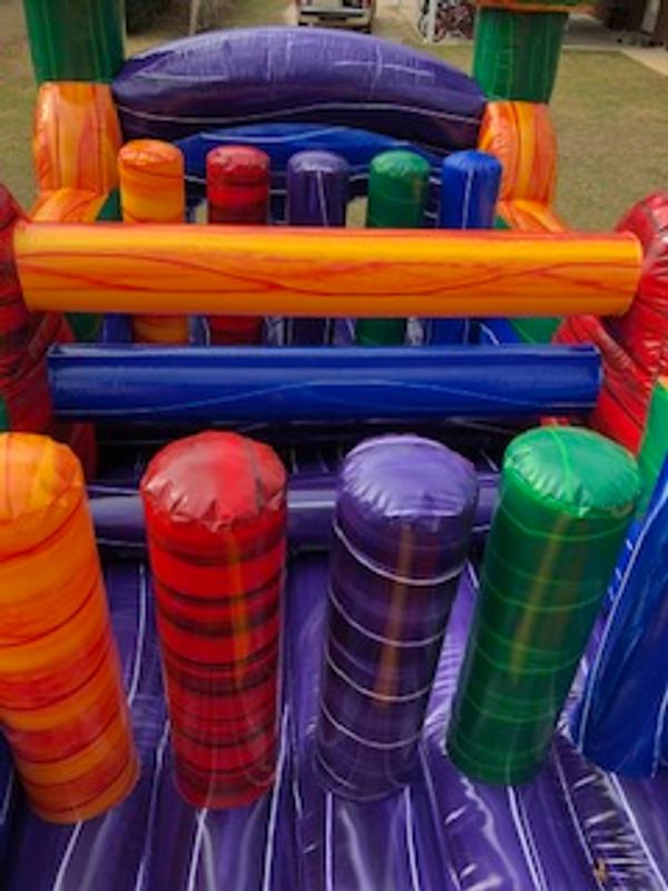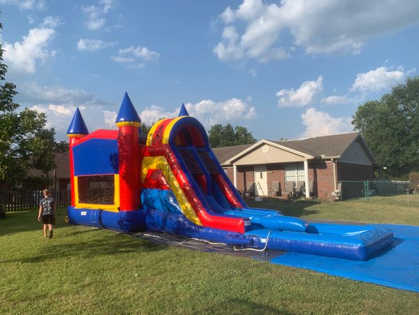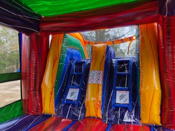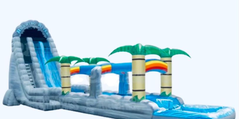 27 ft Roaring River Dual lane water slide. This unit rents for $510+tax with delivery included if you live local. This Unit is 27 ft tall approximately 20 ft wide and 65ft long.